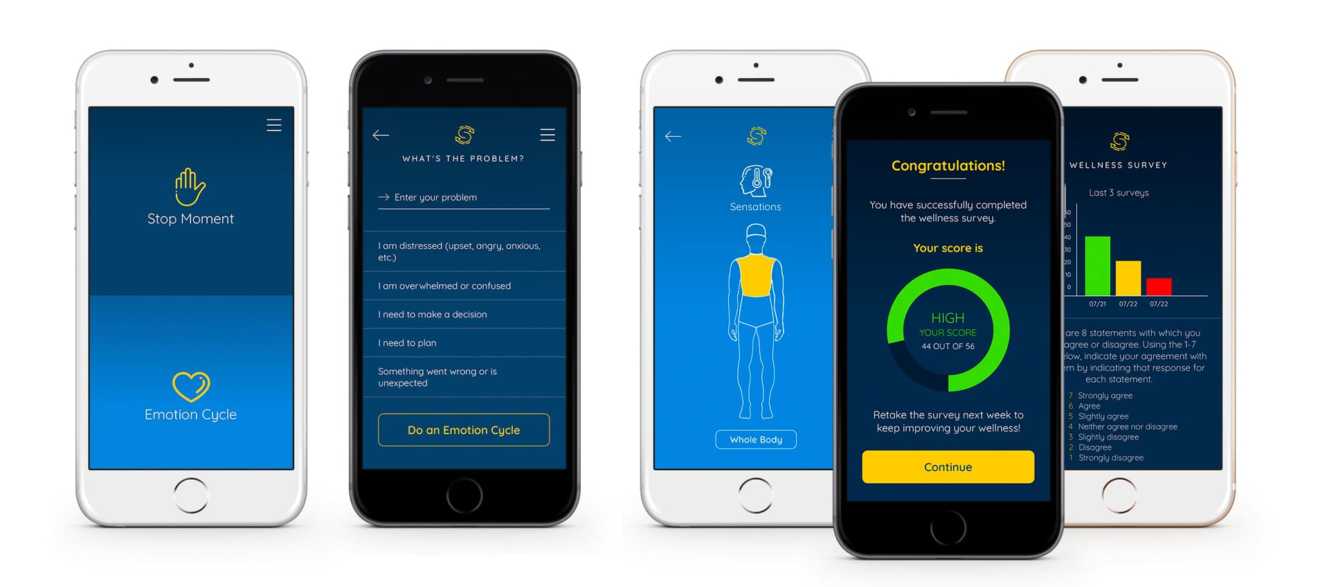 With this particular audience in mind, the app needed to be very user friendly, easy on the eyes, accessible, versatile, and efficient. We wanted to give them a fresh look in line with their brand while keeping things simple. We quickly learned that this is a complex app with many different flows and very specific “evidence based” functionalities. We took the time to learn the flow for each element including the Stop Moment, Emotion Cycle, Stop Logs and Wellness Surveys. During the programming phase, we implemented a phone from app function, sharing via customizable email, in app video tutorials, customizable color themes, and reminder push notifications. Additionally, since this is simultaneously a research tool, we built a backend that serves as both a content management system and reporting tool to track user usage and adapt the app content over time.